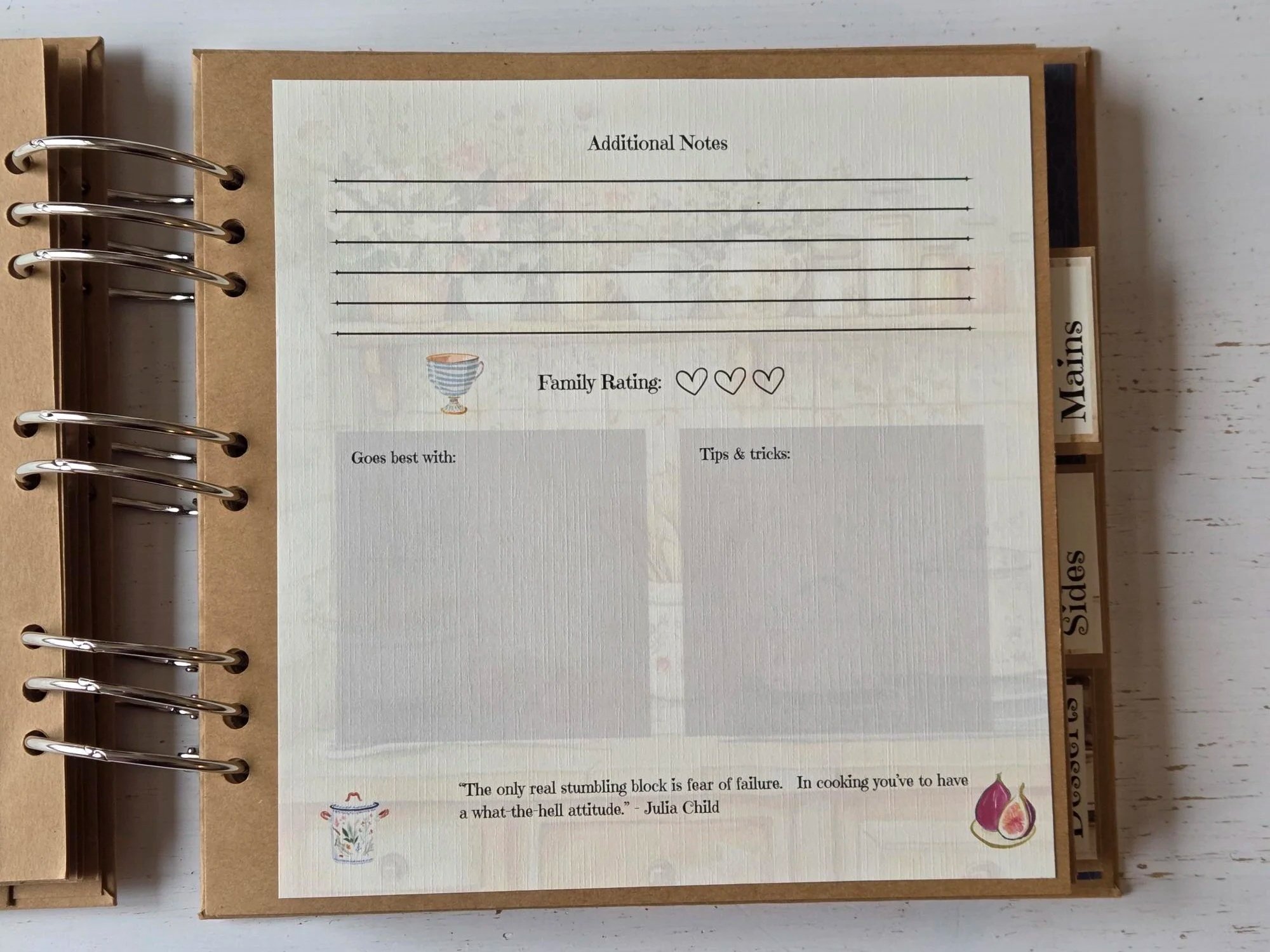 Included are helpful printed shopping list pages, making it easy to plan and prepare for your meals. The book can be fully personalized around your favourite dishes, turning it into a unique reflection of your culinary style.